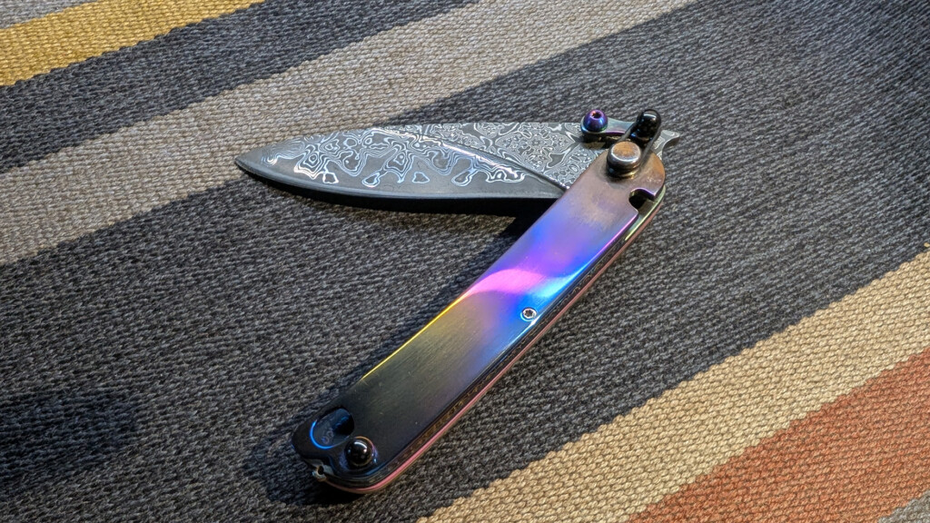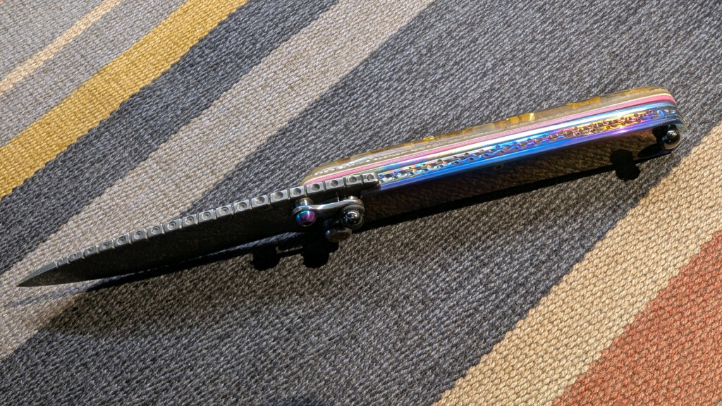 Couteau pliant modèle « Le B du bassin », lame en acier damassé inox, coeur VG10, platine et dos titane, plaquette en galuchat de raie stabilisé en époxy incluse de copeaux de feuille d’or.